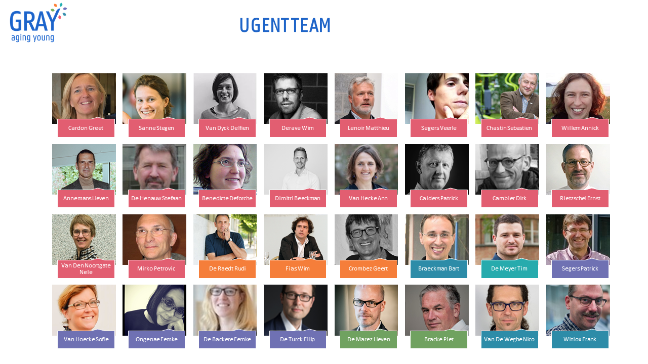 Interdisciplinair samenwerken is wat GRAY ambieert en typeert. Op 17 november 2020 vond een eerste experten meeting plaats. Door middel van een 5 min pitch heeft elke onderzoeker zijn expertise of onderzoekslijn voorgesteld. Elk met hun eigen kijk op verouderen. Razend boeiende dag! De experten zitten verspreid over 6 faculteiten (verschillende kleuren op onderstaande foto) en 12 vakgroepen aan de Universiteit Gent.